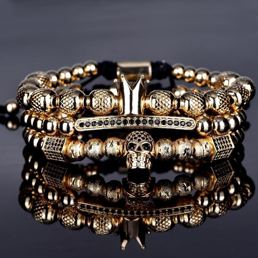 Stonique Crafts 4 Piece Set – Featuring a Gold Crown Bracelet, Dark Crystal, Diced Skull, and Roman Bangle. Handcrafted from premium stainless steel and gold plated, adjustable to fit all. Designed in Pakistan, these bracelets are made to never fade, tarnish, or lose color, offering a luxurious touch to any style.