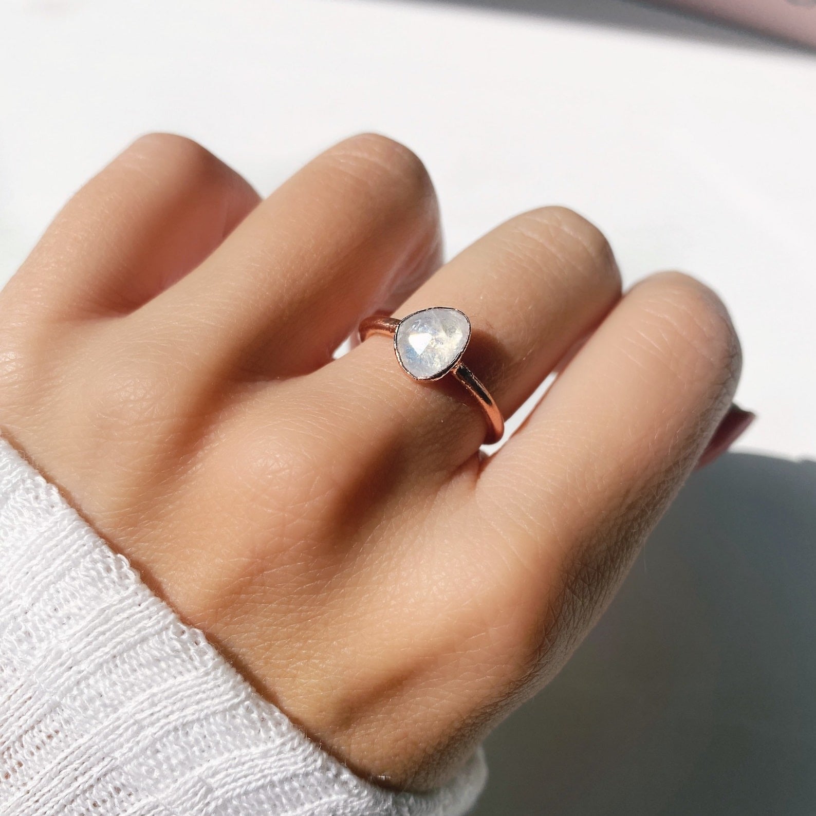 Rosecut rainbow moonstone electroformed with a thick round band of pure shiny copper creating a beautiful elegant ring. Also available in gold and silver finish.